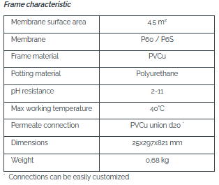 Frame 5RT consists of 5 hollow fiber membrane budles glued in a filtration frame suitable for MBR and industry submersible applications. Membrane used can be P60 or surface treated P6S (not suitable for lab work as surfactnat will leach out). Frame modules can be easily stacked in to a larger membrane units.