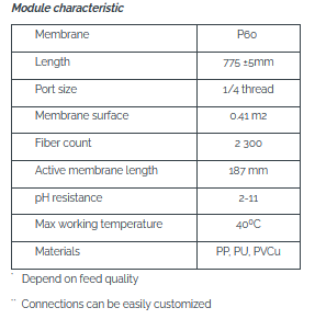 Small immersed hollow fiber module for MBR/sludge sampling. Dead end filtration and weighted bottom of the module makes for easy operation. Standard P60 membrame is used, it is neceseary to wet the membrane before use. It is sensible to mechanicaly secure the module before submerging.