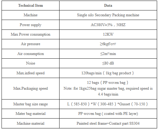 Automatically pack small bag product into larger PP woven master bag. mainly involvedindetergent powder, rice, sugar, wheat flour industry. The automatic secondary packaging machine handle a variety of packaging patterns, including 1-column. 2-columns. etc