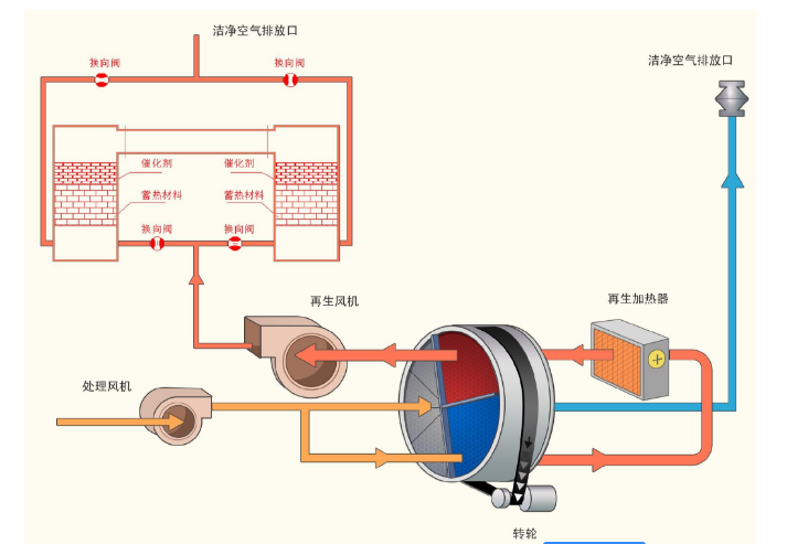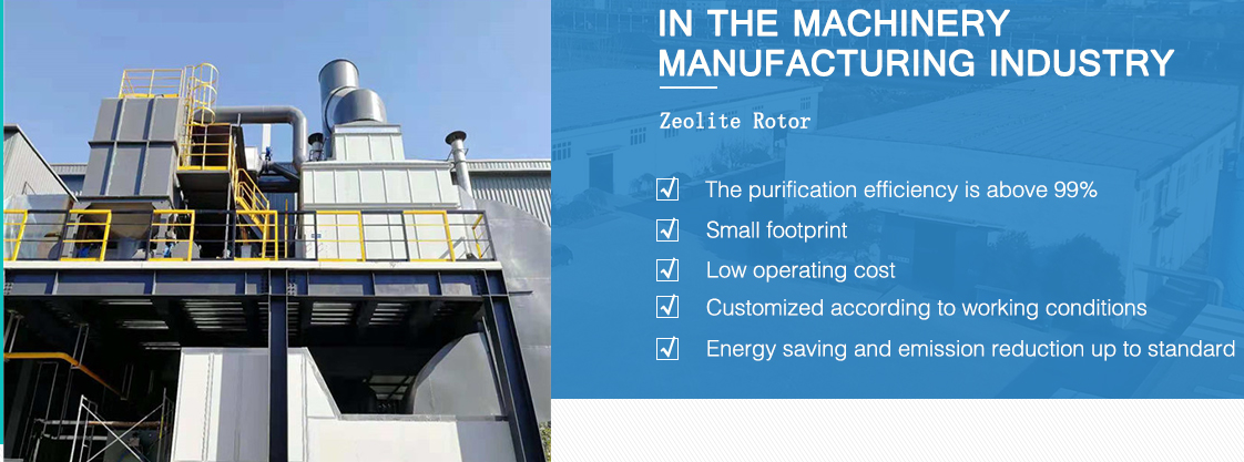 The main structure of the zeolite rotor is a rotating wheel filled with an adsorbent, which is divided into three regions, namely an adsorption region, a regeneration region, and a cooling region. The vocs is introduced into the adsorption area through a blower, and the vocs pollutants therein are adsorbed, and the exhaust gas is purified and discharged. Subsequently, the adsorbent was rotated to the regeneration-zone, and during contact with the high-temperature air, VOCS was desorbed and flowed out with the regeneration air, and the adsorbent was regenerated. The regenerated adsorbent is first cooled through the cooling zone, and then rotated to the adsorption zone to re-adsorb. As the rotor rotates, the adsorbent periodically adsorbs, desorbs, and cools to achieve purification of organic waste gas.