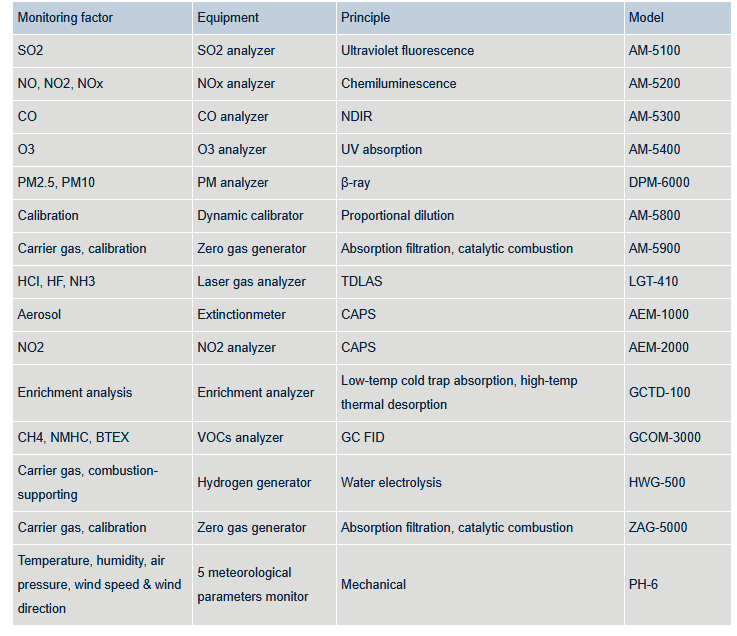 This system is mainly composed by sampling system, analysis instrument, calibration system and data acquisition system. Gaseous pollutant analyzer includes SO2 analyzer, NOX analyzer (chemiluminescence), O3 analyzer, CO analyzer, VOCs analyzer, laser gas (HCl, HF, NH3, etc.) analyzer, NO2 analyzer (CAPS Principle). The particulate matter analyzer consists of PM2.5 analyzer, PM10 analyzer and extinctionmeter (aerosol analyzer).