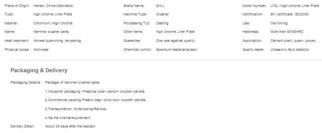 Our company can customize in line plate with clients` needs, we also offer super strengthening wear resistant medium chromium alloy materials. Its expected service life is 2-3 times that of high manganese steel and it causes little noise and pollution. We use refining, vacuum casting, directional solid and etc technical’s’ to increase the grain refinement and make the hammers performance achieve the best performance..