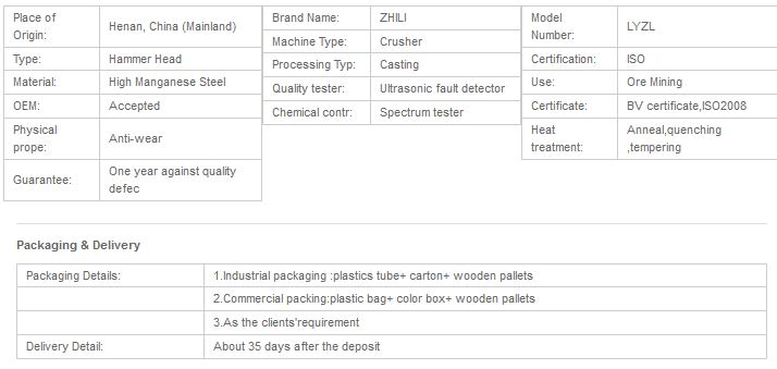High manganese hammers: while casting, we not only add molybdenum, vanadium,titanium,nickle,boron and other rare alloy elements.Meantime, we specially adopt variety of alloy modifier to strengthen the matrix. Those hammers use refining, vacuum casting,directional solid and etc technicals to increase the grain refinement and make the hammers performance achieve the best performance.