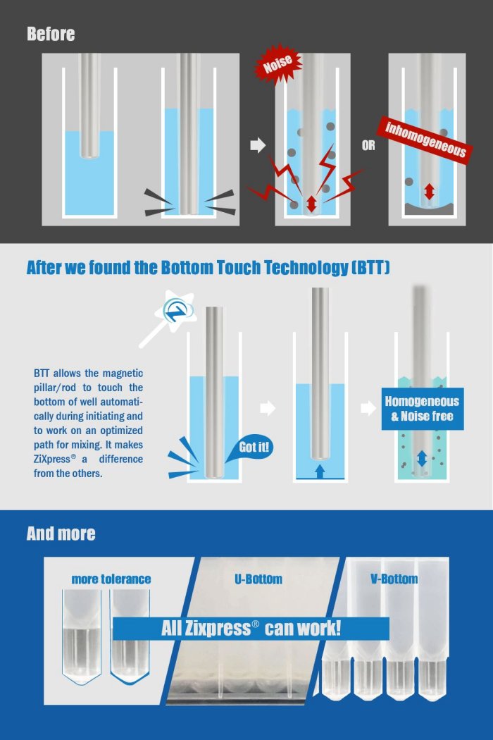 ZiXpress® is an open magnetic rod/pillar nucleic acid isolation platform. Beside the flexibility in throughput and the compatibility of reagents, our outstanding Bottom Touch Technology (BTT) also allows flexibility and compatibility with consumables, meanwhile improving homogeneity and reducing noise. BTT is what makes ZiXpress® outstanding from other competitors in the market. Also, with our fully editable protocols, the ZiXpress® is perfect for diagnostic and research labs in any industry.