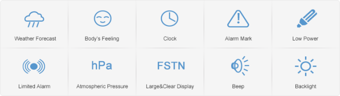 Large LCD with wide view angle. Ergonomic design. High accuracy measurement. High or low limit alarm. MAX / MIN / AVG query. Weather forecast. Ultra low power design with single Li-polymer battery.Most popular related searches