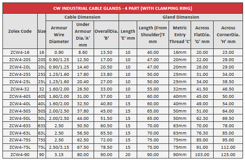 Industrial cable glands - 4 part (with clamping ring). Glands: Material: Finish. Brass: Natural Brass or Nickel Plated.
