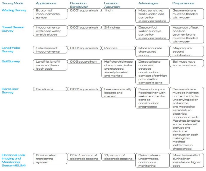 The bare liner test is to detect electrical current flowing through a hole in the geomembrane liner using a small amount of water that is temporarily placed in contact with the liner using a squeegee. One output of an LLSI power supply is connected to earth ground or the GCL and the second output is connected to the scanning sensor through an LLSI electronic leak detection unit. When the water in the leak contacts earth ground or the GCL, a circuit is established and the electrical current will increase. The LLSI electronic leak detector unit converts the increase in the current to an audible tone indicating the presence of a leak.