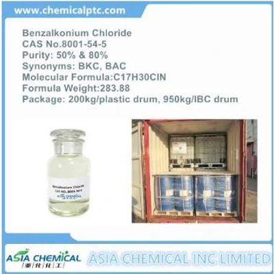 Benzalkonium Chloride CAS No.8001-54-5 Purity: 50% & 80% Synonyms: BKC, BACMolecular Formula:C17H30CIN Formula Weight:283.88 Package: 200kg/plastic drum, 950kg/lBC drum