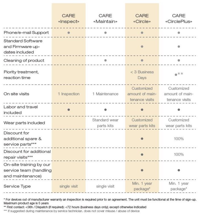 - Visits include exchange of the regular wear parts and test of all major components using specific instructions and test routines.