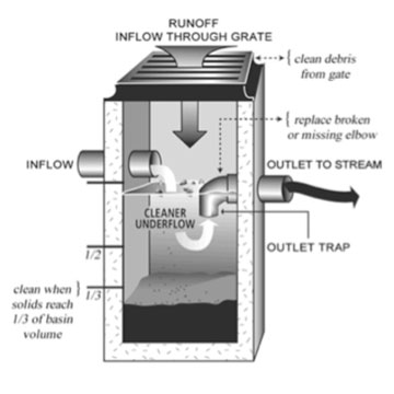 Maintenance on your catch basins will depend on how much material flows into your catch basin, the depth of your catch basin and the location of your outlet. Many catch basins are built with the outlet on the base of the catch basin instead of being suspended within the catch basin its’ self, as demonstrated in the illustration. When this happens, the sewer tends to become clogged more often with debris that would either sink to the bottom of the sump or material that would float above the outlet trap.