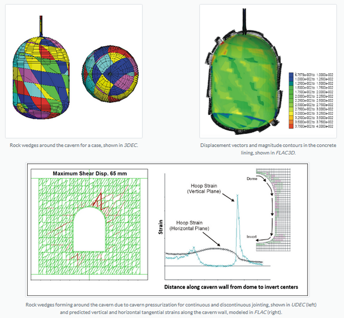 Itasca provides solutions for storage of natural gas or compressed air in lined and unlined caverns. Our diverse team with expertise in analyzing geo-structural interaction, geomechanical, thermal and creep coupled problems assesses the stability and long term performance of storage caverns due to combinations of critical loading conditions in singular and group cavern settings by means of 2D and 3D numerical modeling.