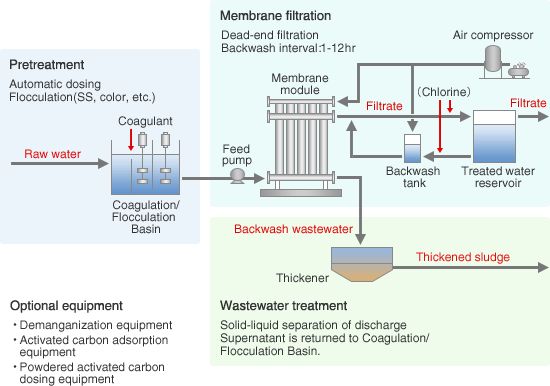 The "Ceramic Membrane Filtration System" is a reliable technology to produce clean water by removing the turbidity, bacteria, and cryptosporidium and other protozoa contained in raw water sources such as surface water and ground water. Using a unique ceramic membrane as a filter, this system is a low cost and long life filtration system. Therefore it can enable a water supply system to meet recent demands for safe and tasty water.