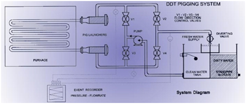 A schematic of the DDT Process is shown below. The process begins after the completion of “steaming out” of the residue feedstock in the assigned heater. Pigg launchers are then installed on both the inlet and outlet pipes of the assigned fired heater. These launchers provide the connection points for the pressurized waterlines and permit the loading and unloading of the appropriate Pigg. Pressurized water, supplied from a pumping unit, pushes a flexible Pigg through the fouled heater tubes.