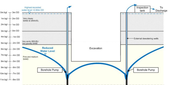 OGI rigorously designs dewatering systems with abstraction filtration media to produce silt free discharge water, tailored specifically to the geology encountered.