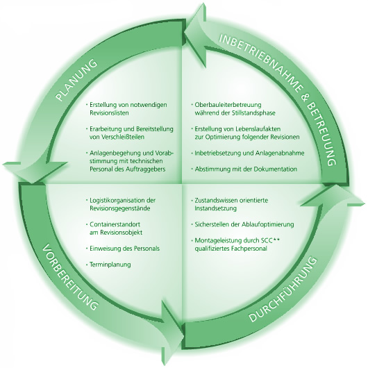 Downtimes of production facilities in refineries or power stations represent highest requirements to personnel, material and the quality of the complete implementation. Checking of the aggregates must be carried out in short time frames. The success of the revision depends on the exact preparation and planning.