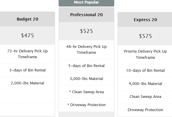 Dimensions: 6’ high X 8’ wide X 12’ long. Price per dumpster dumped. Loyalty contractor pricing available.