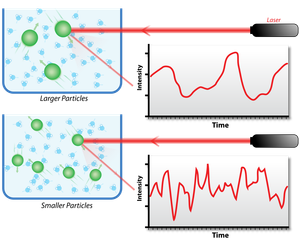 Dynamic light scattering (DLS), also known as photon correlation spectroscopy (PCS) or quasi-elastic light scattering (QELS), is a prevalent analytical technique for determining particle sizes and distribution in suspensions or polymer solutions.