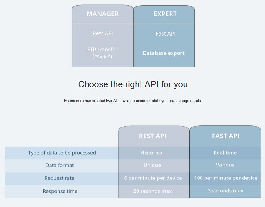 Are you a software company, a smart-building manager or an integrator looking to include an air quality solution in your next project? EcomData lets you transfer data collected by Ecomesure’s IoT systems and access it right on your own platform, website or application. These data can be transferred using FTP, via an API or exported from a database. Choose the EcomData service level that best suits your needs.