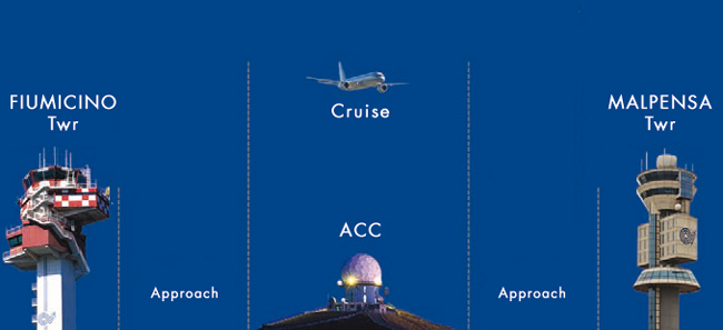 The handling of the flight passes then to the Area Control Center (ACC), whose duty is to harmonize each aircraft entrance and exit from the consistent traffic flowing along inside the airways.