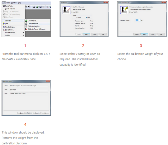 Check out the procedure for peace of mind to maintain your instrument’s accuracy. The system is supplied with a factory force calibration (which can be restored at any time). However, if you wish to calibrate at a specific weight, you can perform the following procedure: