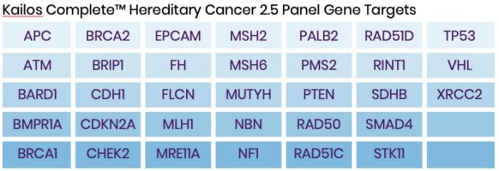 Enable your clients to test for hereditary cancer mutations by utilizing Kailos Genetics` industry-leading clinical laboratory. Our CAP-accredited laboratory uses next generation DNA sequencing to provide the most complete, accurate and transparent genetic variation information, delivered in your preferred format for easy integration into your health information system. Our non-invasive sample collection method, rapid turnaround times, multiple reporting options and affordable rates are designed to provide your clients with immediate access to precision medicine solutions.