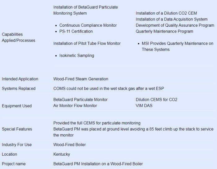 Mechanical Systems, Inc., engineered and installed a continuous emissions monitoring system (CEMS) for a wood-fired, steam-generating boiler. For this project, using a continuous opacity monitoring system (COMS) was not possible because of wet stack gas, so the BetaGuard Particulate Monitor provided a better solution for this application.
