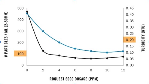 The filtrate samples are collected for particle count analysis and turbidity testing. The results are then plotted on a chart that compares the filtrate quality at each tested dosage. Based on the results, we recommend the lowest dose of the RoQuest™ product that achieves the target filtrate quality of less than 100 particles per mL and less than 0.20 NTU.