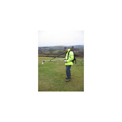 In the image to the right we are using a caesium vapour magnetometer to locate buried drums and waste on an old landfill site. Note the differential GPS antenna behind the operator. This set-up allows us to survey a site without setting out survey lines, allows rapid data collection with sub-meter positioning.