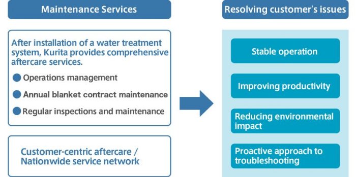 Kurita also promotes packaged maintenance services that include the maintenance and management of water treatment systems and the replacement of consumables at customers` factories, and offers an operation management service run by Kurita`s on-site staff specialized in the operation management of water treatment facilities. Taking advantage of the comprehensive capabilities of the Kurita Group that include chemicals, we support solutions to the issues customers face at their factories by undertaking the operation management of not only water treatment facilities, but also utilities such as boilers.