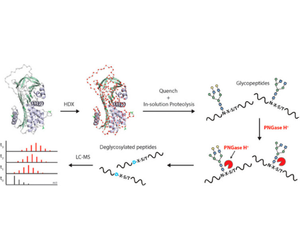 Glycoproteins perform highly diverse functions in cells, ranging from cell-cell recognition and immune functions to pathogen identification. Studying glycoproteins using HDX-MS involves several challenges such as the limited digestion of protein due to steric hindrance from glycans or difficulty in the identification of peptides due to the heterogeneity in the glycan composition. Increasingly, studies are proposing new research strategies, such as labeling glycoproteins in their fully native glycosylated state followed by post-quench steps where glycans are further digested by acid-active endoglycosidases to remove polysaccharides, and simply analyzing the deglycosylated peptides by LC-MS.
