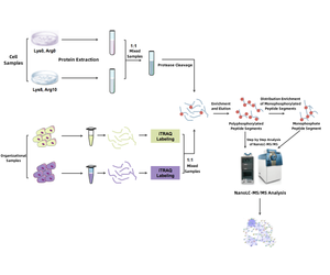 Protein phosphorylation is a reversible post-translational modification where amino acid residues in proteins are phosphorylated by kinases, which attach covalently bonded phosphate groups. This modification alters proteins' conformation, potentially activating, deactivating, or changing their functions. Research into protein phosphorylation enhances our understanding of biological processes and helps to define the mechanisms of diseases linked to abnormal phosphorylation levels. Due to the low concentration and broad dynamic range of phosphorylated proteins in biological samples, enrichment of phosphorylated peptides is essential before performing quantitative proteomics to increase the detectability of these modifications.