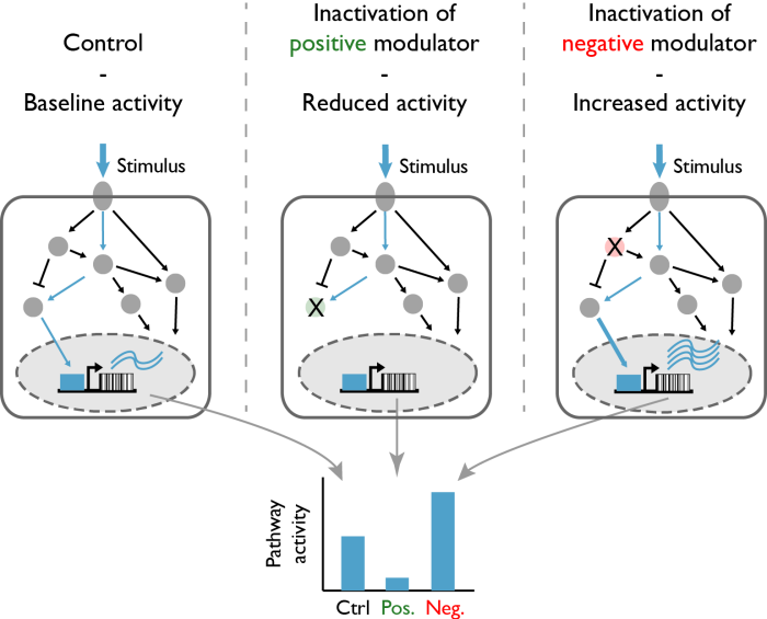 For example, a neuronal activity reporter that expresses unique RNA molecular barcodes can be coupled to a pooled shRNA or sgRNA/CRISPRi library to identify targets, which modulate neuronal activity. In such a screening approach, inactivation of a positive modulator of activity-dependent neuronal signaling decreases the neuronal activity reporter (Fig. 1, center panel). By contrast, inactivation of a negative modulator of activity-dependent neuronal signaling increases the neuronal activity reporter (Fig. 1, right panel).