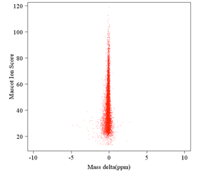 The error distribution between the molecular weight of all matched peptides and their theoretical molecular weight is shown in the following diagram: