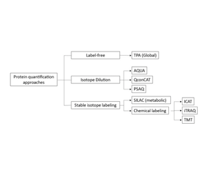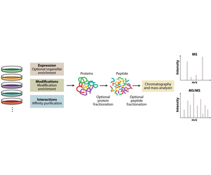 Due to significant developments in mass spectrometry (MS) technology and software, quantitative proteomic analysis has become the primary method for protein quantification. This technique is mainly based on bottom-up (shotgun) proteomics, which relies on the analysis of proteins digested by proteases in biological samples. Depending on the study, optional enrichment of organelles, modifications, or affinity purification should be performed beforehand. For instance, proteomic study of expressed proteins can be conducted on whole-cell lysates or purified organelles, typically involving the specific enrichment of peptides with post-translational modifications (PTMs), and affinity purification of interacting partners. Pre-separation at the protein or peptide level can be introduced to increase coverage and dynamic range. Subsequently, the use of chromatography and MS for analysis generates large MS datasets and tandem mass spectrometry (MS/MS) data, which include quantitative peptide information and characteristic fragment patterns for sequence determination.