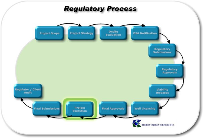 Management of the regulatory process is one of the unique strengths of Remedy Energy Services. Our personnel can guide your project through the process and ensure that all of your requirements will be met or exceeded within the required time frame. At Remedy we focus on the entire regulatory process, from the conception of the well to final drilling and completions reporting.