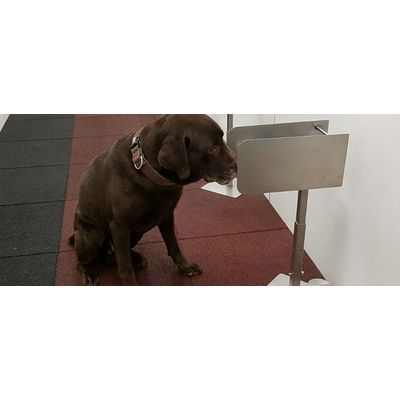 The filters are then transferred to an analysis room, where they are placed on 6 stands. A specially trained dog moves down the line of stands, sniffing around each one. The dog is trained to sit by the stand if it detects explosive vapour