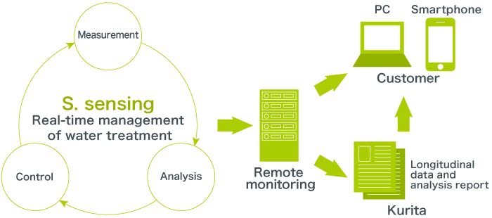 One area in which these services are applied is the water treatment chemicals business. We analyze the water quality of target facilities on a daily basis and report the analysis results to customers. We have also launched a new water treatment management service called "S.sensing," with the aim of building higher value-added systems for customers by visualizing the water treatment effect more directly. We will realize optimal water treatment in real time with a system that combines Kurita`s original core technologies for measurement, analysis, control, and monitoring by installing the sensing equipment in the plant facilities of customers.