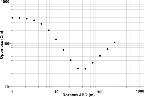 Resistivity soundings is basic resistivity technique. This technique bases on the relegation of current electrodes from the potential electrodes in subsequent step to increase the depth of investigation. The point for which the measurement is made is in the middle between the potential electrodes.