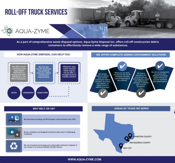 Matagorda Area Roll-Off Construction Debris Containers. Sometimes it’s simply not cost-effective to buy and maintain your own debris containers, particularly when you’re using them for sludge or slurry that you will then have to pay someone to remove for you. We offer an economical alternative, renting you a suitable roll-off container, then picking it up and disposing of the contents when you’re ready. If you want a dependable solution to your waste needs, we’re here to help. It’s Quick, convenient and hassle-free!
