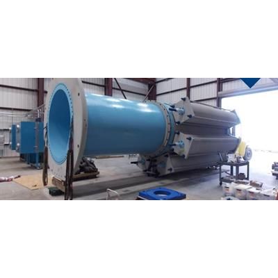Universal Steel America, Inc. supplied the two 2.75” thick rolled cylinder portions of this design. The overall roundness of the cylinders was extremely critical with much tighter tolerances than ASME Code requirements. We constructed a dual rabbit to inspect these extremely tight tolerances. The OD of the rabbit slid through the inside of the larger assembly and the ID of the rabbit slide over the OD of the smaller assembly. Roundness was critical because of the sliding action of the product being produced.