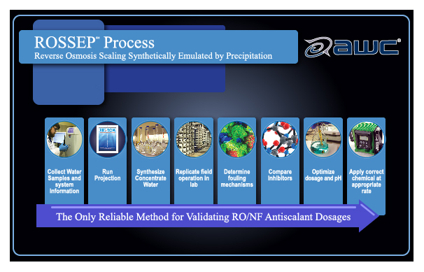 AWC has developed a process that simulates your water quality and system conditions so as to guarantee the recommended pH and antiscalant dosage for your operation. This process predicts the outcome of a RO/NF pilot for control of inorganic species without interference from organic, biological, or colloidal materials which would be present in a field study.