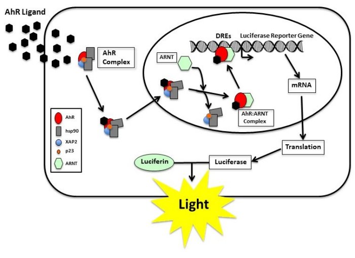 The mammalian cell was genetically engineered and involved stable insertion of an AhR-responsive luciferase reporter gene into the DNA of the cell. When ligands (dioxins and other AhR agonists) enter into the cell, the AhR signaling pathway is activated, the luciferase gene is expressed and luciferase is produced. When luciferin, the substrate for luciferase, is broken down by luciferase, light is produced and it can be easily measured. The amount of luciferase activity is directly proportional to the concentration of ligand-activated AhR and thus the amount of AhR agonist). This bioassay allowed measurement of the relative amount of AhR ligands (agonists) in a sample extract and when the extract has been subjected to a clean-up procedure that allows isolation of AhR-active dioxins and dioxin-like chemicals, the induced light output is directly related to the potential dioxin-like toxicity of the extract.