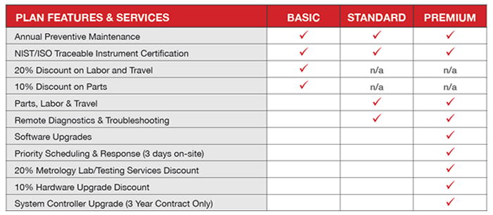 Zygo’s Service Program offers a wide range of support so that you can get the most out of our products and solutions. Take advantage of worry-free maintenance and global repair coverage for all of your Zygo hardware and software. Each offering provides increasing levels of best-in-class service and support such as extended warranties, preventative maintenance, instrument certification, and more. Premium service packages include a guaranteed 3-day turnaround time for both covered service and annual recertification, wear and tear parts, software upgrades, and much more. See the table below to find a plan suited to your needs.