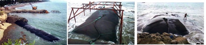 These geotextile tubes and bags are known as "soft structures" that do not effect the habitat and are much more cost effective than "hard structures" such as rocks or armour accropodes. Also, GeoTextile Tubes can be hydraulically or mechanically filled in water depths of up to 15 feet, or filled on dry land. They are UV resistant and are especially important to projects where rocks, concrete or other hard structures are in short supply. Using these tubes and bags can add strength to the coastline, help prevent erosion or act as a sand dune.