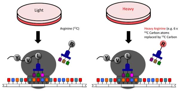 SILAC-based quantitative proteomics (SILAQ) is an innovative technology used in high throughput quantitative analysis of large protein complexes, protein-protein and protein-small molecule interactions. SILAC service of Creative Proteomics provides an unbiased strategy that can reveal how specifically either inhibitors, or other perturbations, affect the dynamic properties and cellular distributions of proteins. It can also be used as a sensitive and effective method to determine the specific interaction partners of proteins in the cell.Quantitative proteomics has increasingly gained impact in life science research as a tool to describe changes in protein expression between different cellular states. Stable isotope labeling by amino acids in cell culture (SILAC) is a powerful technique for relative quantification of proteins. Stable isotope labeling by amino acids in cell culture (SILAC) is a simple and straightforward approach for in vivo incorporation of a label into proteins for mass spectrometry (MS)-based quantitative proteomics. SILAC relies on metabolic incorporation of a given `light` or `heavy` form of the amino acid into the proteins. As the two isotopically labeled amino acids are essentially chemically identical, their incorporation does not interfere with normal cell growth, while leading to proteins/peptides that are distinguishable by mass and thus are ideal for mass spectrometric analysis. The method relies on the incorporation of amino acids with substituted stable isotopic nuclei. Thus in an experiment, two cell populations are grown in culture media that are identical except that one of them contains a `light` and the other a `heavy` form of a particular amino acid (e.g. 12C and 13C labeled L-lysine, respectively). When the labeled analog of an amino acid is supplied to cells in culture instead of the natural amino acid, it is incorporated into all newly synthesized proteins. After a number of cell divisions, each instance of this particular amino acid will be replaced by its isotope labeled analog. Since there is hardly any chemical difference between the labeled amino acid and the natural amino acid isotopes, the cells behave exactly like the control cell population grown in the presence of normal amino acid.
