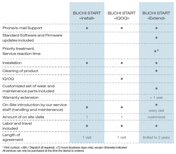 Your advantage from the BUCHI START. BUCHI has your success in mind during the design and development of the product. You can contribute to this and protect your investment by choosing a BUCHI START solution. You will get extra benefits, only available when purchasing the service together with the device. Remember, a long lasting product life time starts with the first day in your laboratory. Device or system Installation. Installation and operational Qualifications. Maintenance contract with extended warranty.
