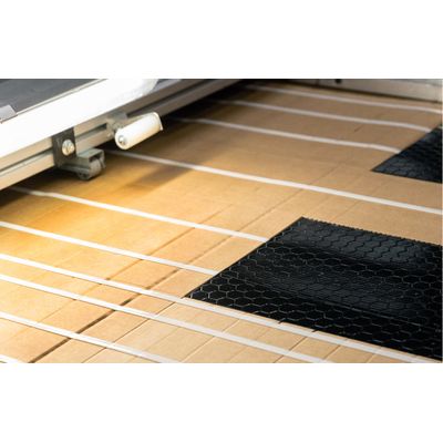 The stiffener is made of cardboard or plastic sheets – on purpose to maintain the objective of weight reduction. This material may be combined with an acoustic damping plate (Fusible Sound Absorber Sheet, IFF), to combat vibration phenomena. The stiffener is fixed to the sheet using double-sided foam adhesive strips or glue. Adhex has a wide range of specific solutions to guarantee an optimal result. The installation is carried out in line according to various possible processes, by simple pressure or in an automated way.