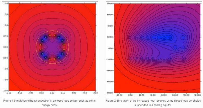 Figure 2 Simulation of the increased heat recovery using closed loop boreholes suspended in a flowing aquifer.