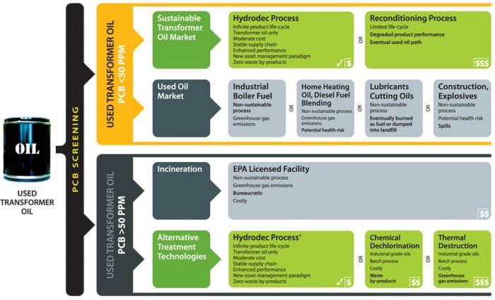 Through a patented process, Hydrodec offers a sophisticated and renewable solution for used transformer oil that is vastly superior to the disposal for energy recovery practices used in the past. With near zero emissions, this environmentally responsible and sustainable means of treating used transformer oil removes all detectable levels of PCBs.