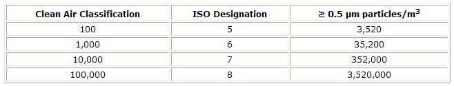 In critical areas such as Class 100 or ISO 5 (area in immediate proximity of exposed sterilized containers/closures and filling/closing operations), the particle per cubic meter must be no more than 3520 particles/m3 in a size of 0.5 micrometers or larger when counted at representative locations normally not more than 1 foot away from the work site, within the airflow, and during filling/closing operations. Supporting areas, or clean room areas where the laminar flow stations are located, must meet at least Class 100,000 (ISO 8) air quality. See table below.
